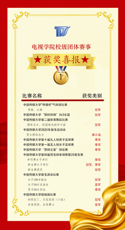 每一份成绩,都展现出电视学院,团结拼搏、永不言弃的精神,都凝聚着全院师生的支持与陪伴,我们珍视荣誉,更珍视过程中每一滴汗水、每一次突破。未来,电视学院将迎接全新挑战,在更多更大的赛场上,挥洒热血、书写辉煌!