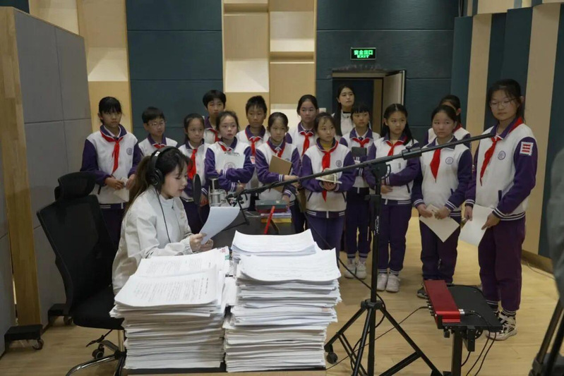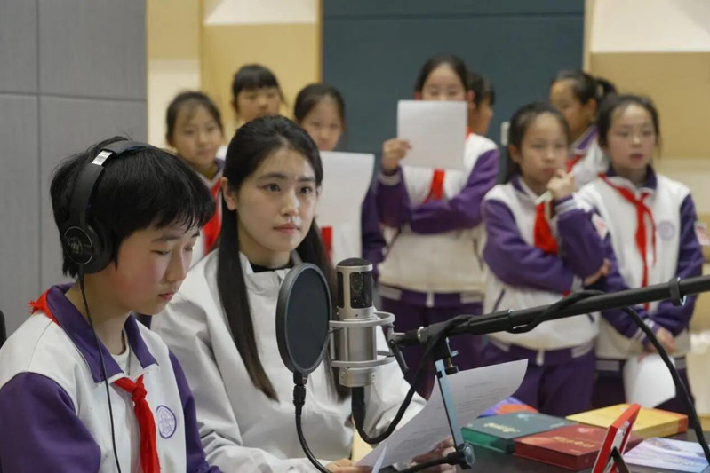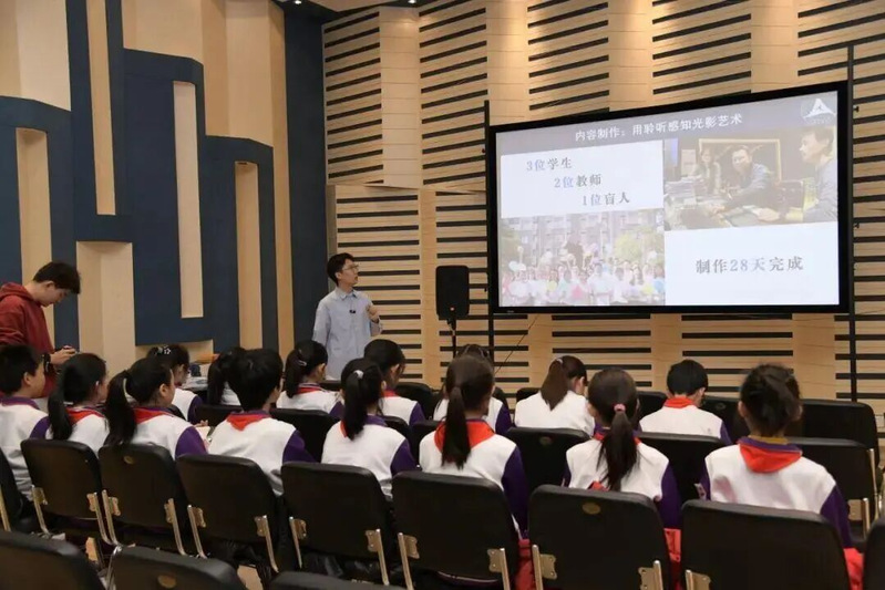 ▲同学们在“光明影院”学生志愿者的带领下体验配音环节